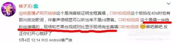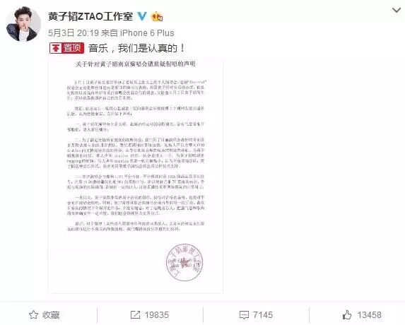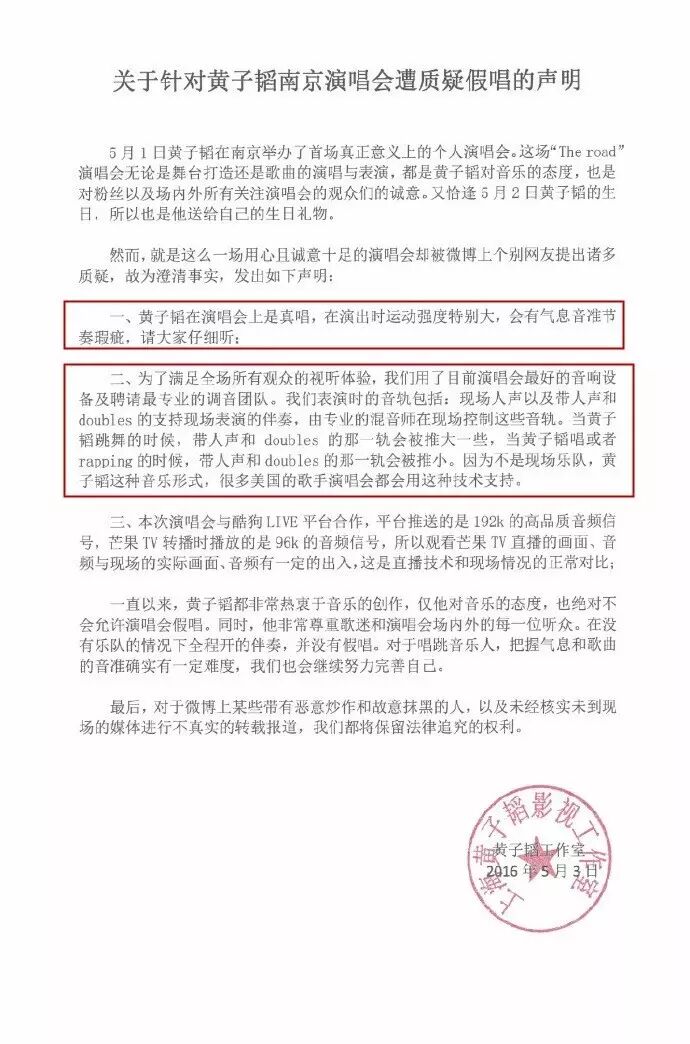 终于,在梁欢喷了一天“黄子韬假唱”后,工作室发表声明“音乐,我们是认真的”。大致意思就是:黄子韬在演唱会上是真唱。