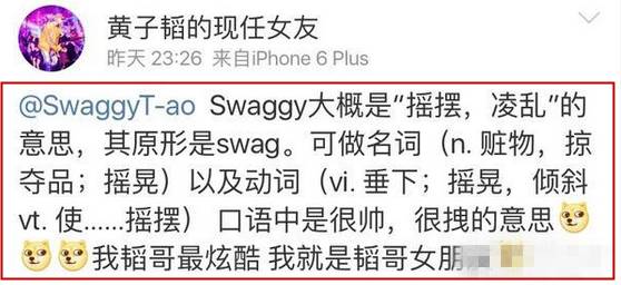 粉丝还解读他的ID前缀Swaggy翻译成大白话就是帅酷狂拽的意思,果然符合韬哥的蜜汁自信。