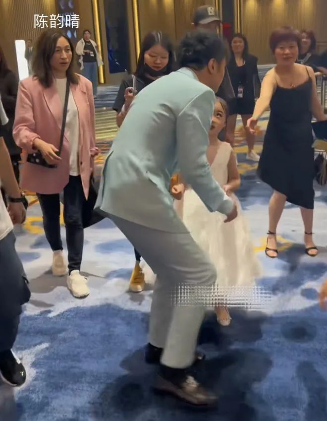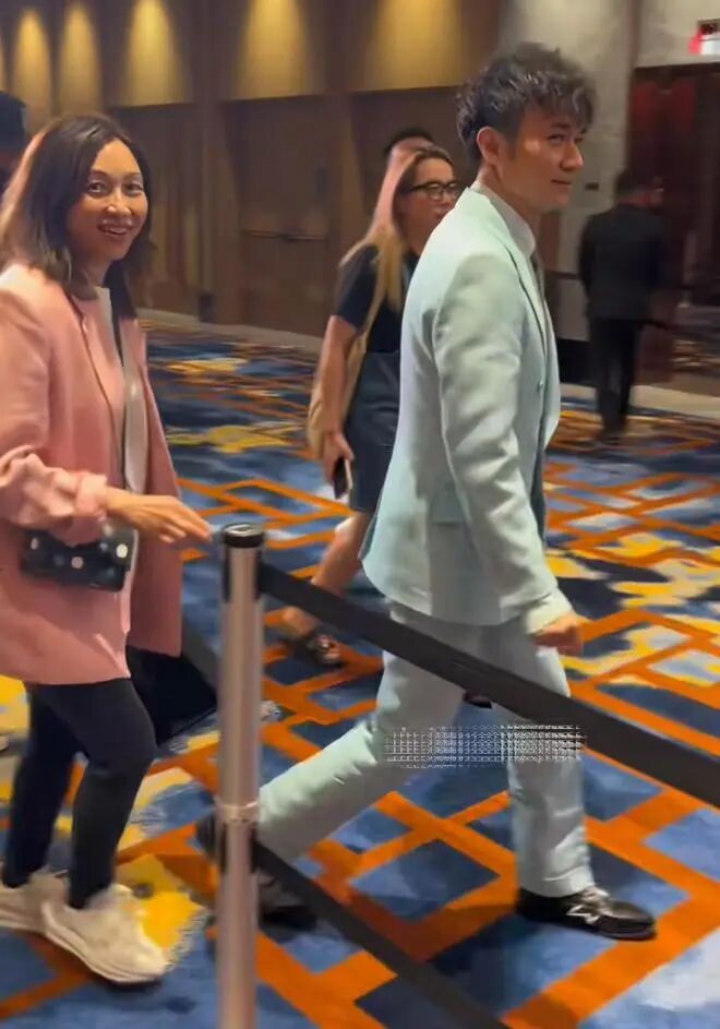 陈韵晴身穿粉色休闲西装,同样也是马卡龙色系,光看上半身和古巨基有点儿情侣装的意思。