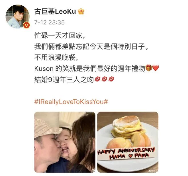 7月12日,古巨基还分享了全家福,特意发文庆祝结婚9周年,由此不难看出他对妻子的重视和爱。