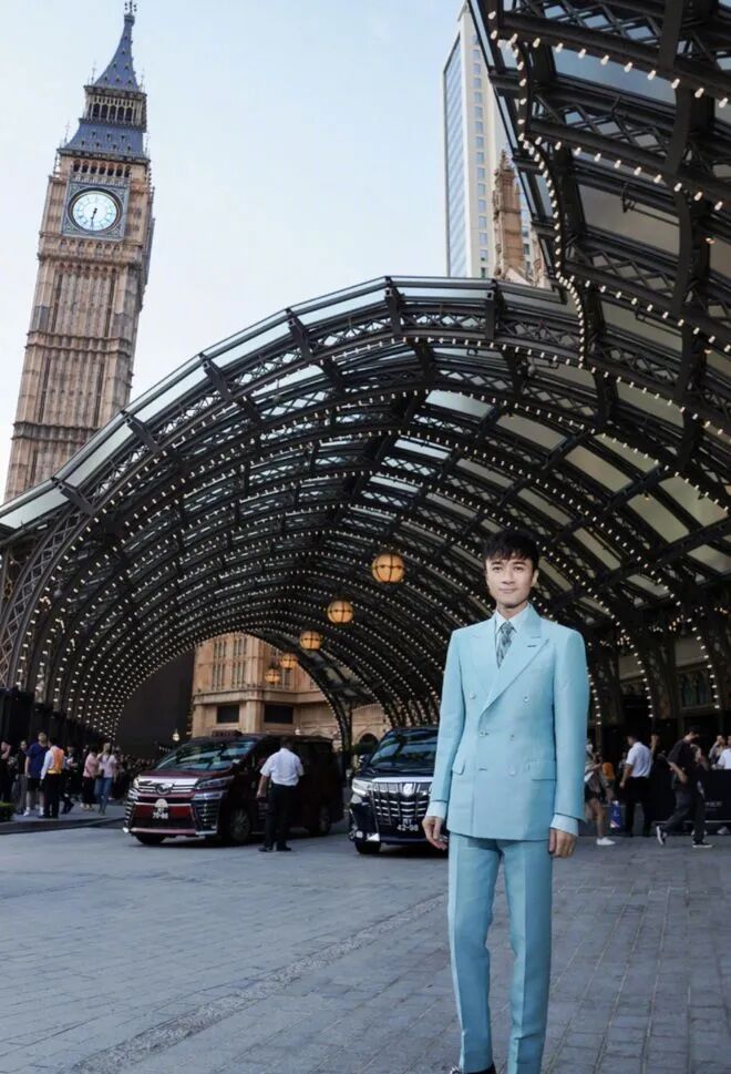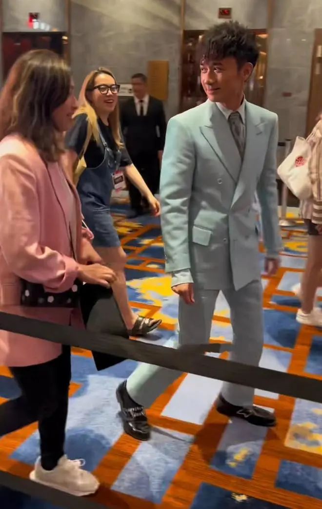 古巨基身穿蓝色西装,50岁帅气依旧,和饰演何书桓时期区别并不大。