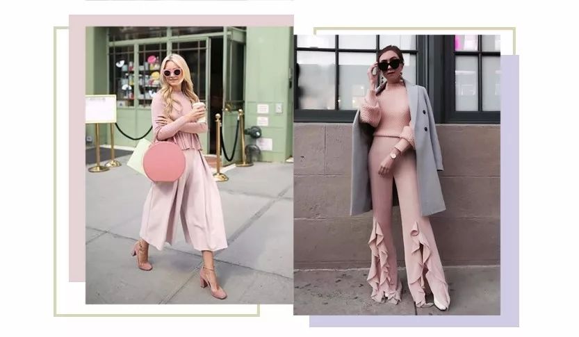 粉嫩嫩的早春搭配阔腿裤和毛衣是很不错的选择,但毛衣尽量选择短款或者扎进裤子里,这样3:7的比例才能显得腿长哦。