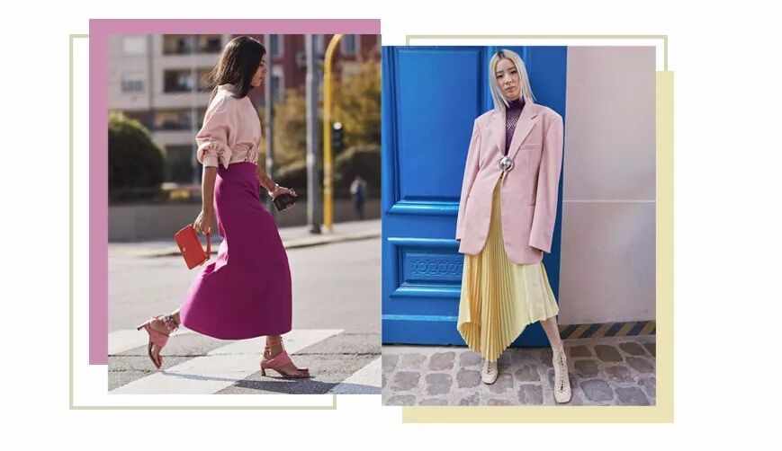 粉色搭配裙子时还可以大胆的与相邻色进行配合,黄色延续少女感,紫色女人味强一些。