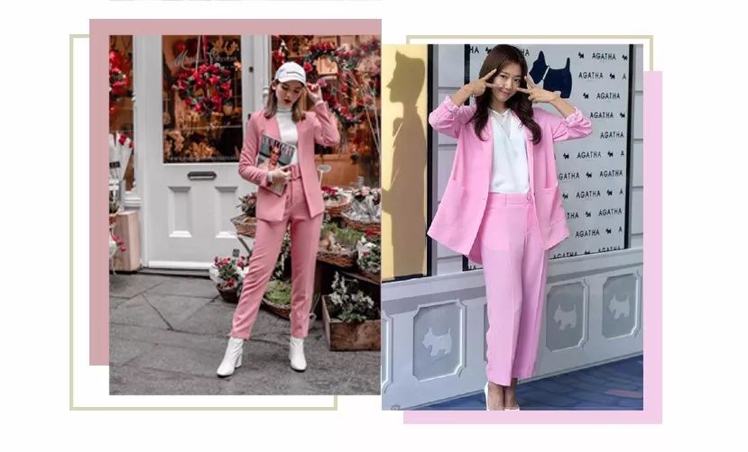 粉色的西服套装最适合年轻的白领们。没有黑西装那么老气,就如朴信惠一样活泼又不失干练之气。记得,用白色打底会更好看。