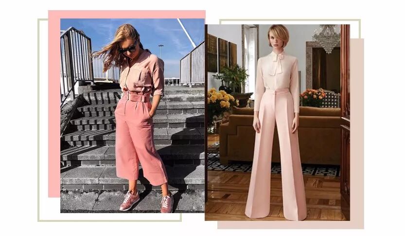粉色裤子建议选择阔腿裤。第一是因为阔腿裤的流行程度较高,第二是因为粉色裤子穿得不好看会显得很俗气,所以将粉色运用到显大气的阔腿裤上,则没有这样的顾虑了。