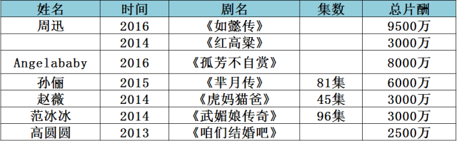 今年初,周迅加盟《甄嬛传》原著作者流潋紫的新作《如懿传》,出演女主角,片酬被曝高达9500万。而她2014年出演同样关注度极高的大IP《红高粱》时的片酬才3000万,即两年时间,周迅片酬已经翻了3倍还多。