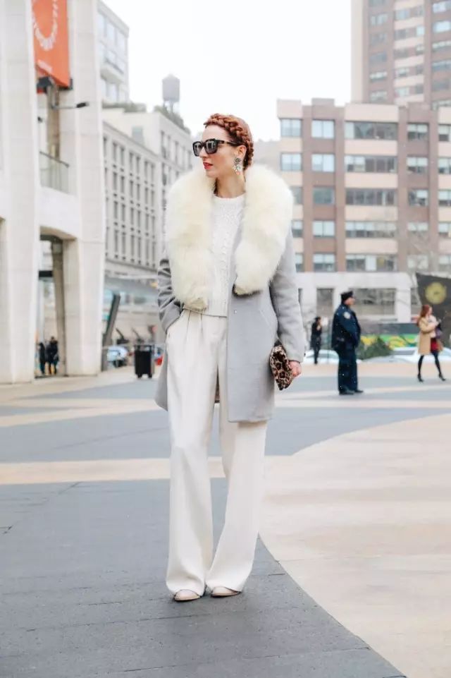 毛领设计更加奢华,灰色大衣+白色毛衣+米白阔腿裤,干净又高级。