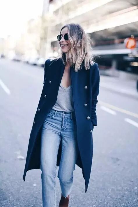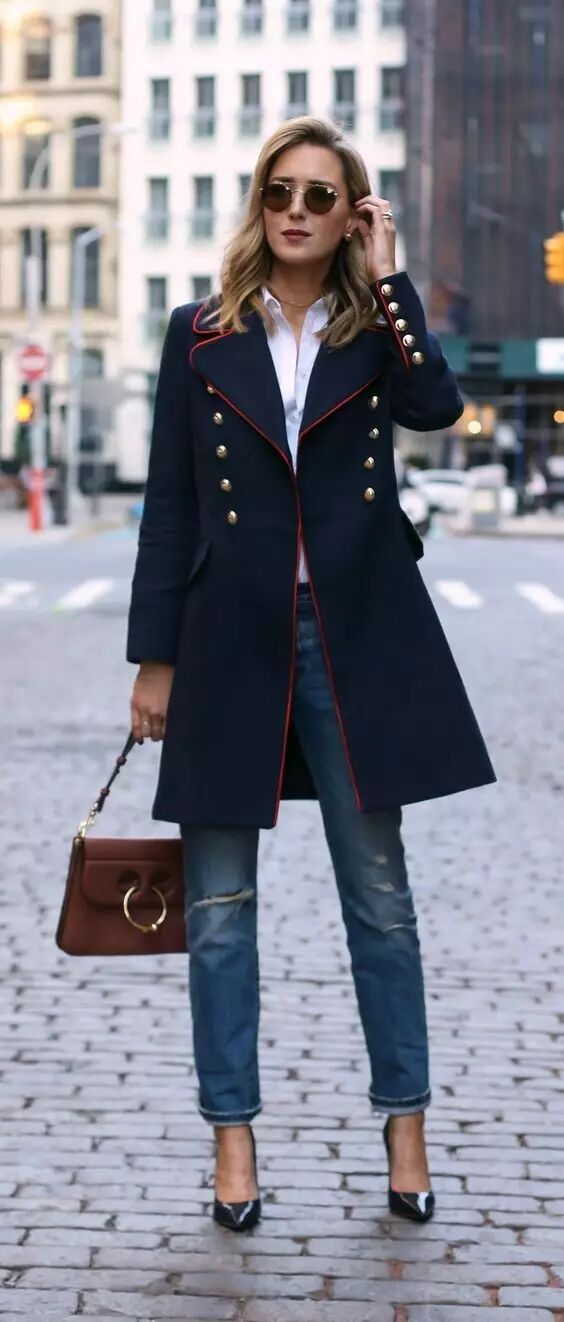 融入军队元素的设计,让大衣更精致帅气。海军蓝大衣搭配白衬衫干练有型。