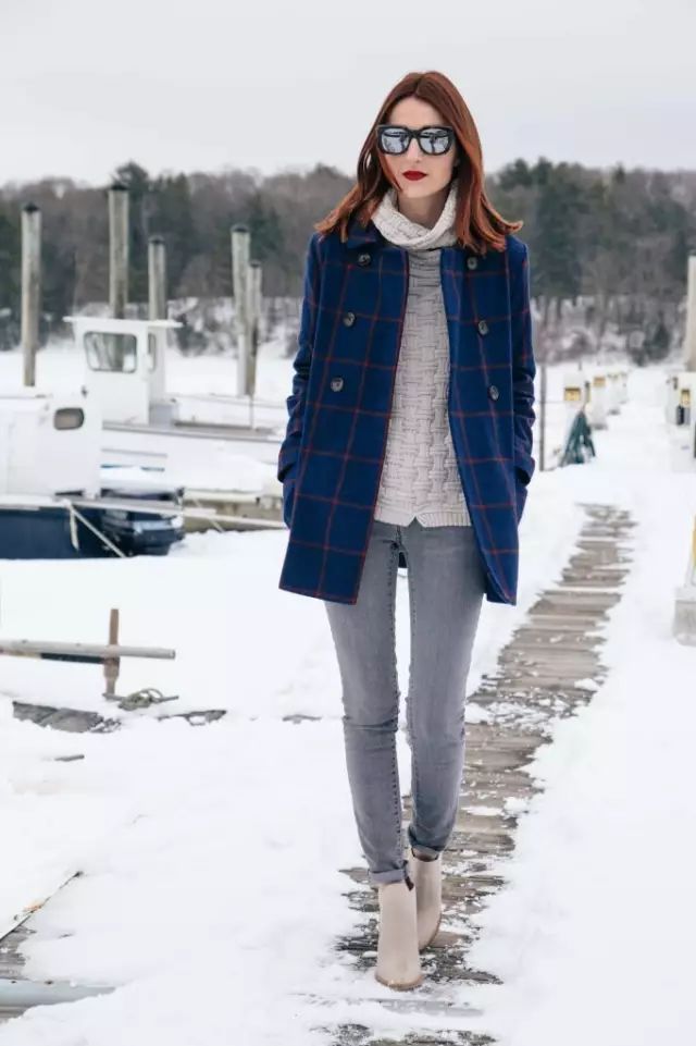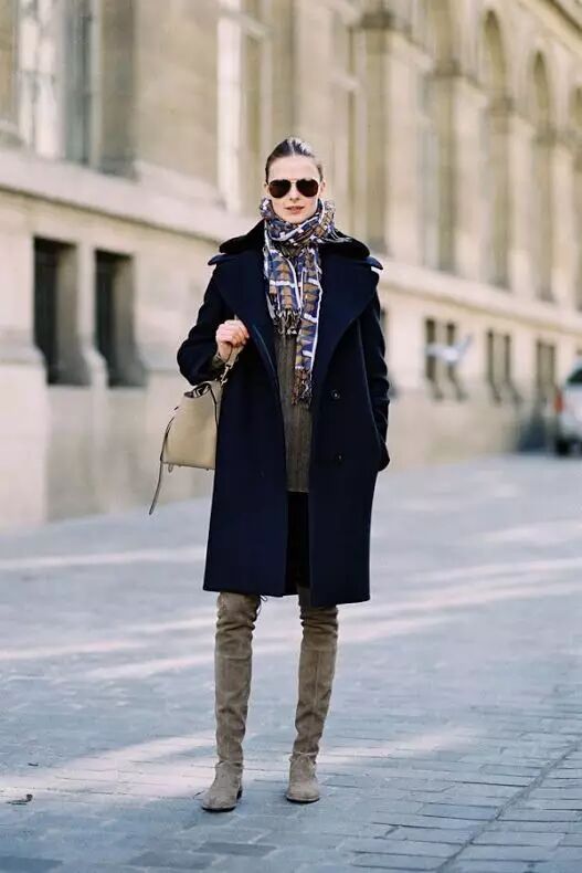 大领设计显脸小,海军蓝大衣+浅灰色围巾+及膝靴,配色高级耐看。