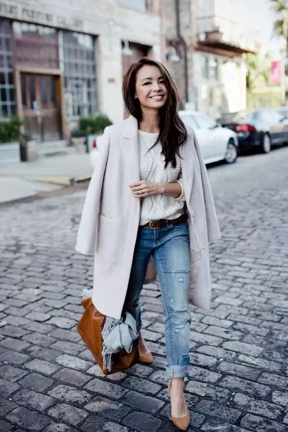 上身纤细可以选择有繁复设计的领口,可以有效增加上围。橡皮粉大衣+白色毛衣+烟灰色牛仔裤,温柔时髦有气质。