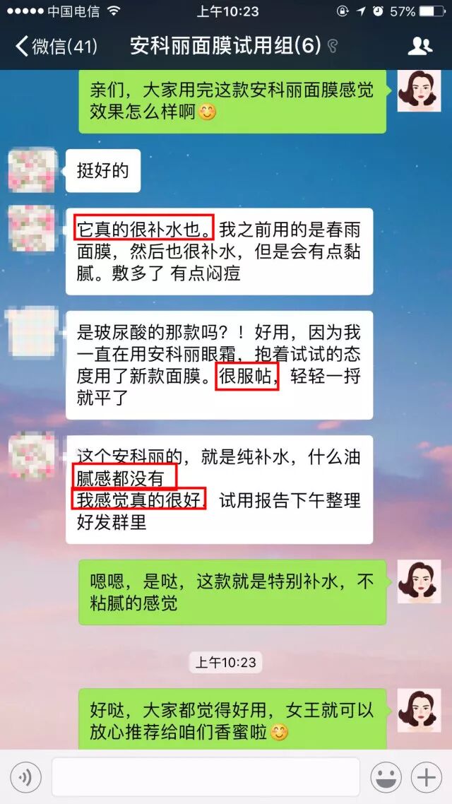 在所有的产品试用组当中,这款面膜是反馈最好的一款,群里的试用伙伴试用完后都开始囤了↓