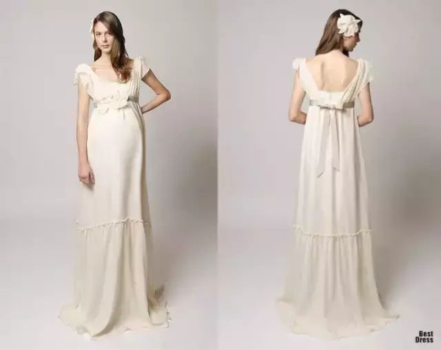 考虑到新娘的活动方便,1.5米以上的大拖尾不适合怀孕新娘,应该选择的是婚纱的后摆比前面仅长10-15厘米的类型。