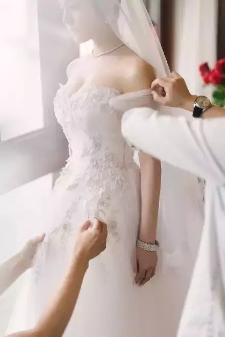化妆师建议挑选轻盈的材质的婚纱礼服。可以像张雨绮一样选择蕾丝比较多的婚纱。