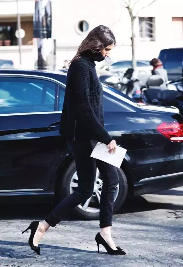 像这样黑色高领毛衣搭配紧身黑色裤装,然后配上一双尖头高跟鞋。简直就是诠释 “冷酷到底” 有没有?有说冷的妹子可以把高跟鞋换成尖头靴~~~▼