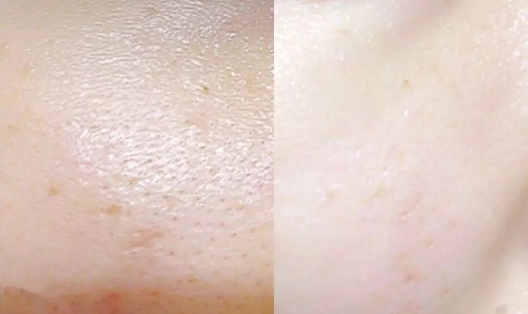 不信你看,左边单用粉底液时,鼻翼卡粉严重,脸颊干巴巴的,毛孔被放大了十倍不止。