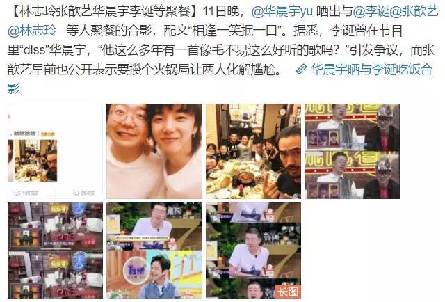 原来,他们几个人是一起相约吃火锅,由张歆艺串的局,因为之前她曾在节目中承诺过要给华晨宇和李诞组局吃顿火锅,化解尴尬,而此番同行的还有袁弘、谭维维等人。