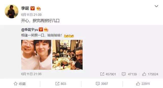 随后李诞也是转发回复了华晨宇:开心,抿完再抿好几口。