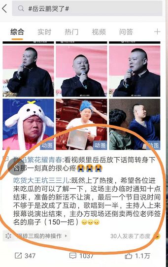 在网友的评论中,这次事件和主办方有着联系,主办方临时通知表演要在10点完毕,岳云鹏原本预备了新活,因为时间不行,所以无法替换,最终一个节目,因为时间不行也改成了互动,然而岳云鹏的歌还是没有唱完。