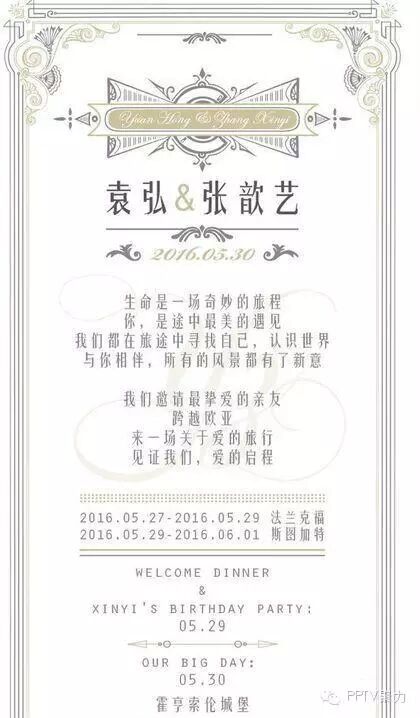 袁弘的喜帖写下“生命是一场奇妙的旅程,你,是途中最美的遇见,我们都在旅途中寻找自己,所有的风景都有了心意”。