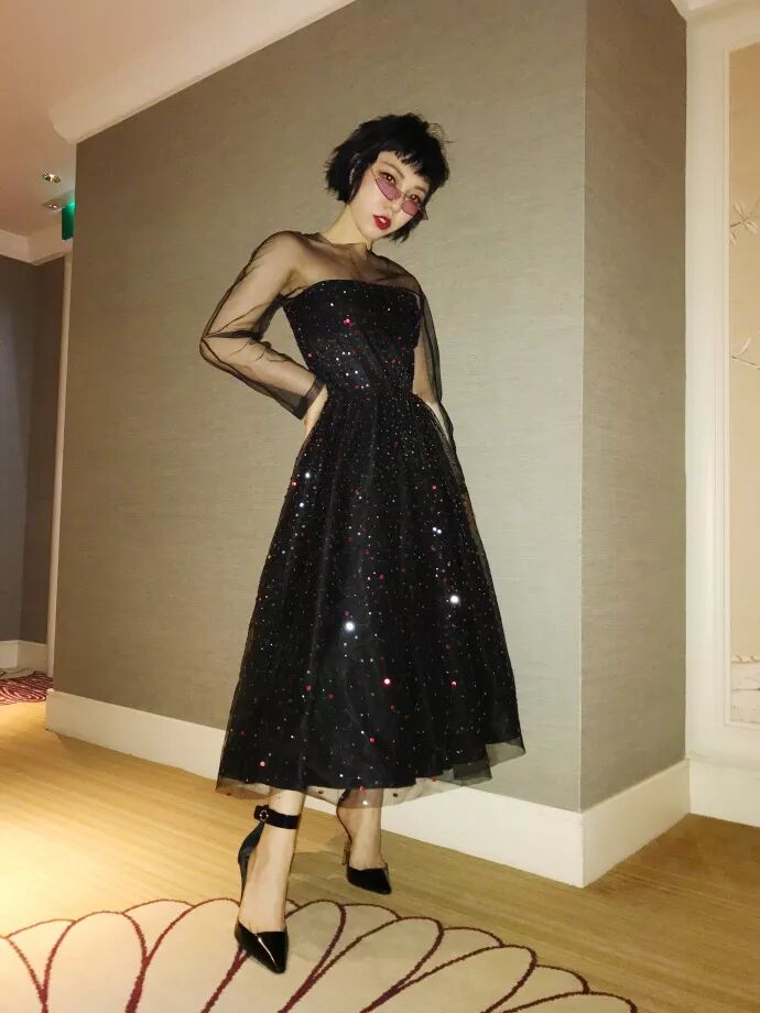 如果说吴莫愁穿皮衣像个战士,那她穿的这套黑色星光闪闪的抹胸裙则是典型的赫本范儿,连脚上的一字高跟鞋都是复古款式的。“狗啃”式的短发造型,让吴莫愁多了几分俏皮的美,彩色墨镜却让画风突转,果然这还是一个追求“嬉皮”或者“摇滚”感觉的女孩。