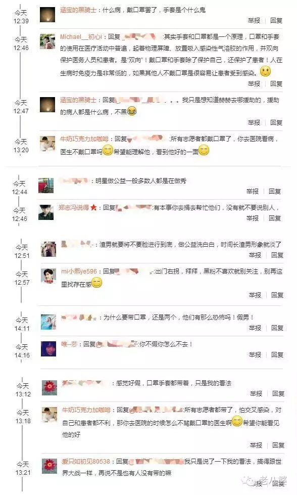 陈赫微博发出后称赞声不断,有网友称“就喜欢你这股能正经能逗比的劲儿。”“有爱心的人最可爱!”不过,也有质疑的声音,有网友说道:“为什么还戴双层口罩,有那么嫌弃他们吗?”“什么病,戴口罩罢了,手套是个什么鬼?”也有网友说“明星做公益就是作秀”,不过这样说是不是有些不合适呢?有些明星是真心在做公益啊!我们怎么可以因为不喜欢或是讨厌一个人而否定他/她做的一切呢?