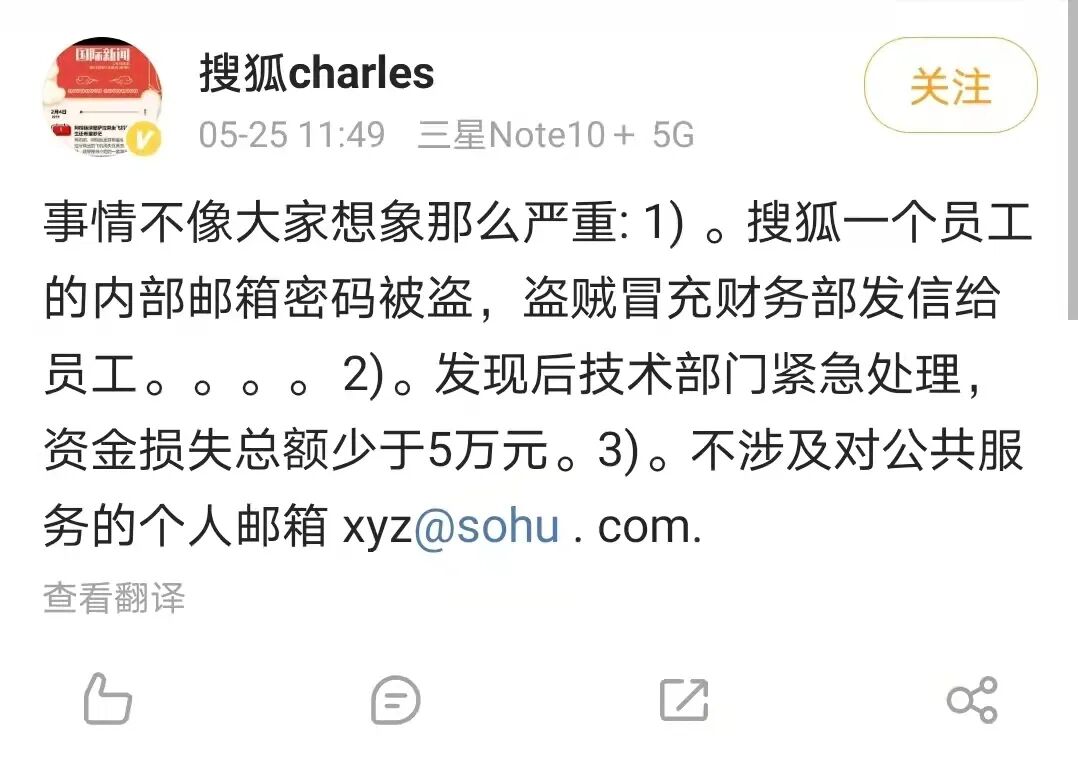 事后,张朝阳发微博回应表示:“事情不像大家想象那么严重: 1) 搜狐一个员工的内部邮箱密码被盗,盗贼冒充财务部发信给员工;2)发现后技术部门紧急处理,资金损失总额少于5万元;3),不涉及对公共服务的个人邮箱 xyz@sohu. com.”。(via 新浪科技)