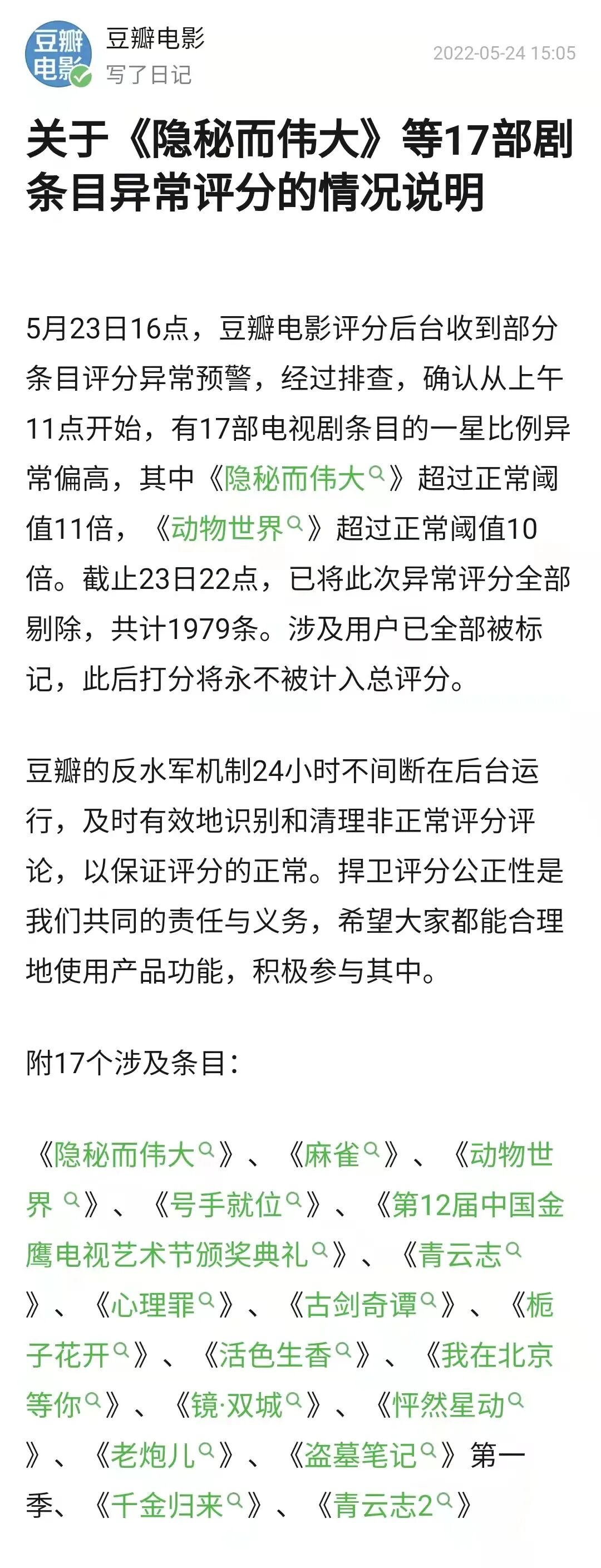 5月24日下午,豆瓣发布公告称,豆瓣电影评分后台收到部分条目评分异常预警,经排查,确认从5月23日上午11时起,共17部影视作品条目的一星比例异常偏高,其中《隐秘而伟大》超过正常阈值11倍,《动物世界》超过正常阈值10倍。
