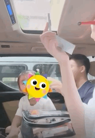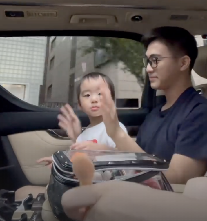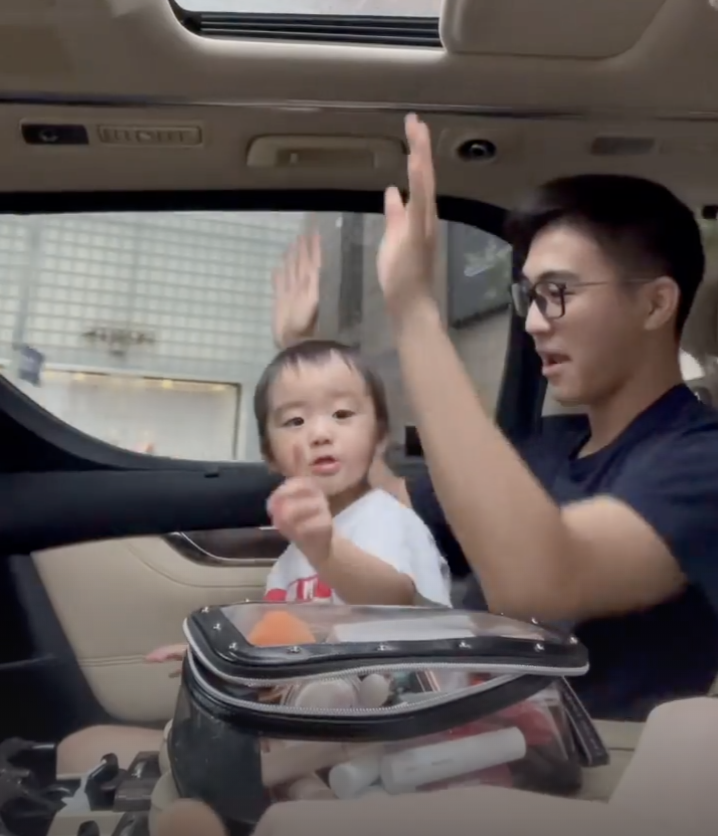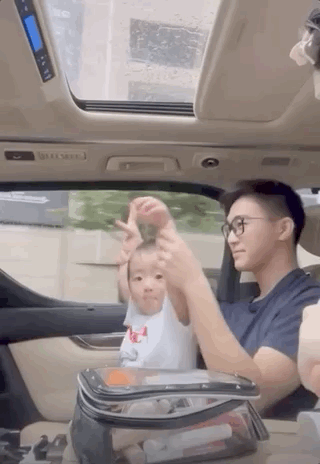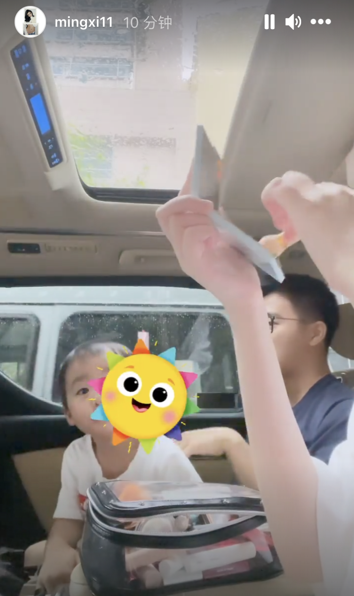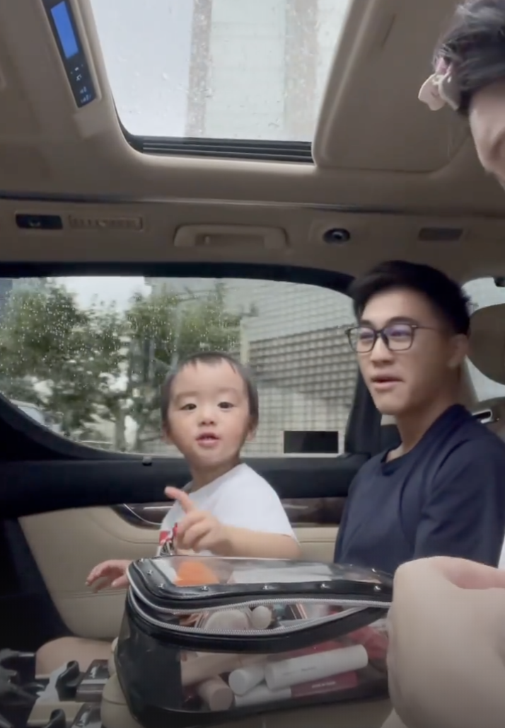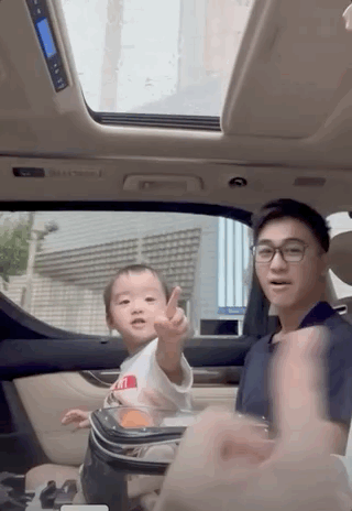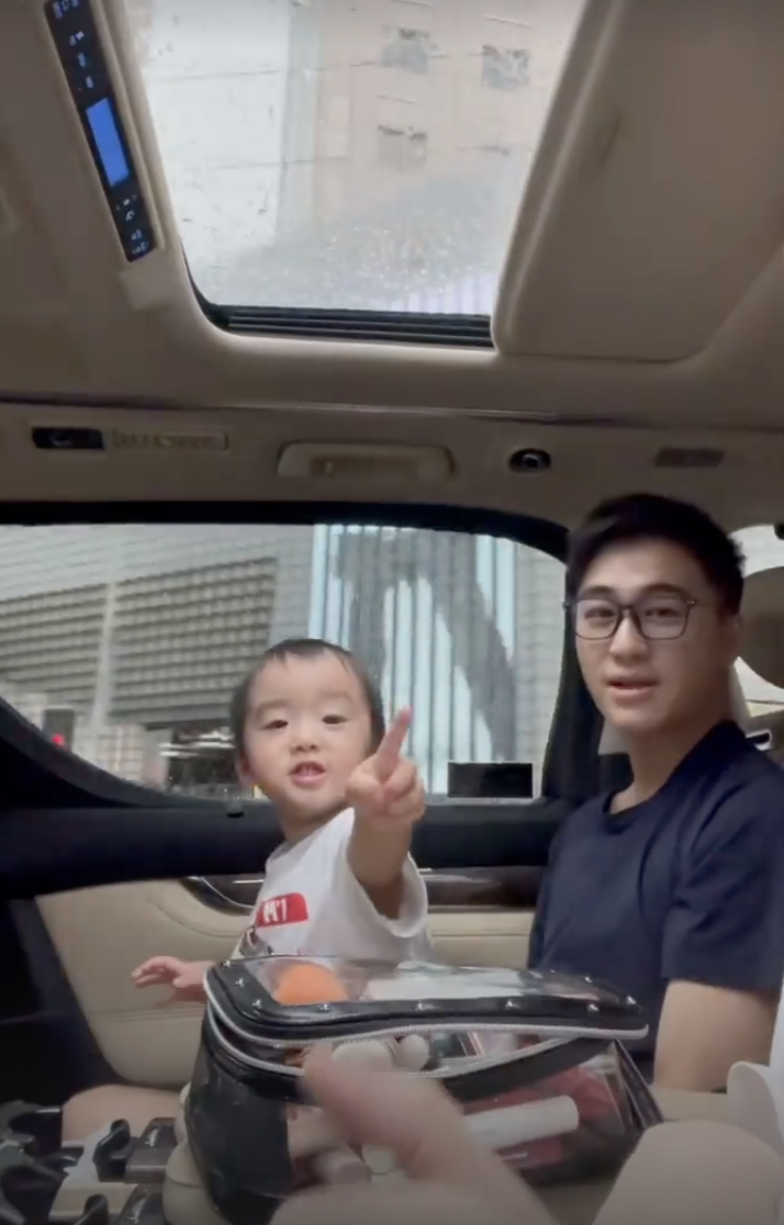 7月31日晚,奚梦瑶分享了一家三口坐在车上的视频。奚梦瑶正在给自己化妆,儿子坐在爸爸的腿上,父子俩挥舞着手一起跟着音乐摇摆。奚梦瑶用一个小太阳挡住了何广燊的脸,只露出来一只眼睛,单眼皮像妈妈,看起来很清秀。