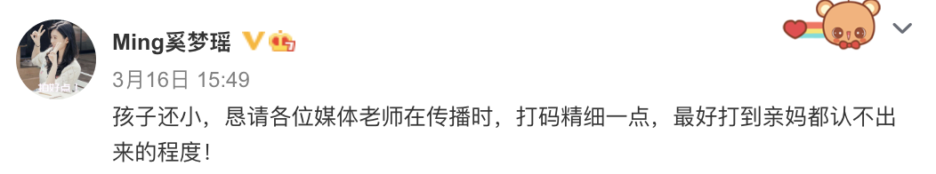 当时奚梦瑶还特意发文谴责:孩子还小,恳请各位媒体老师传播时,打码精细一点,最好打到亲妈都认不出来的程度。