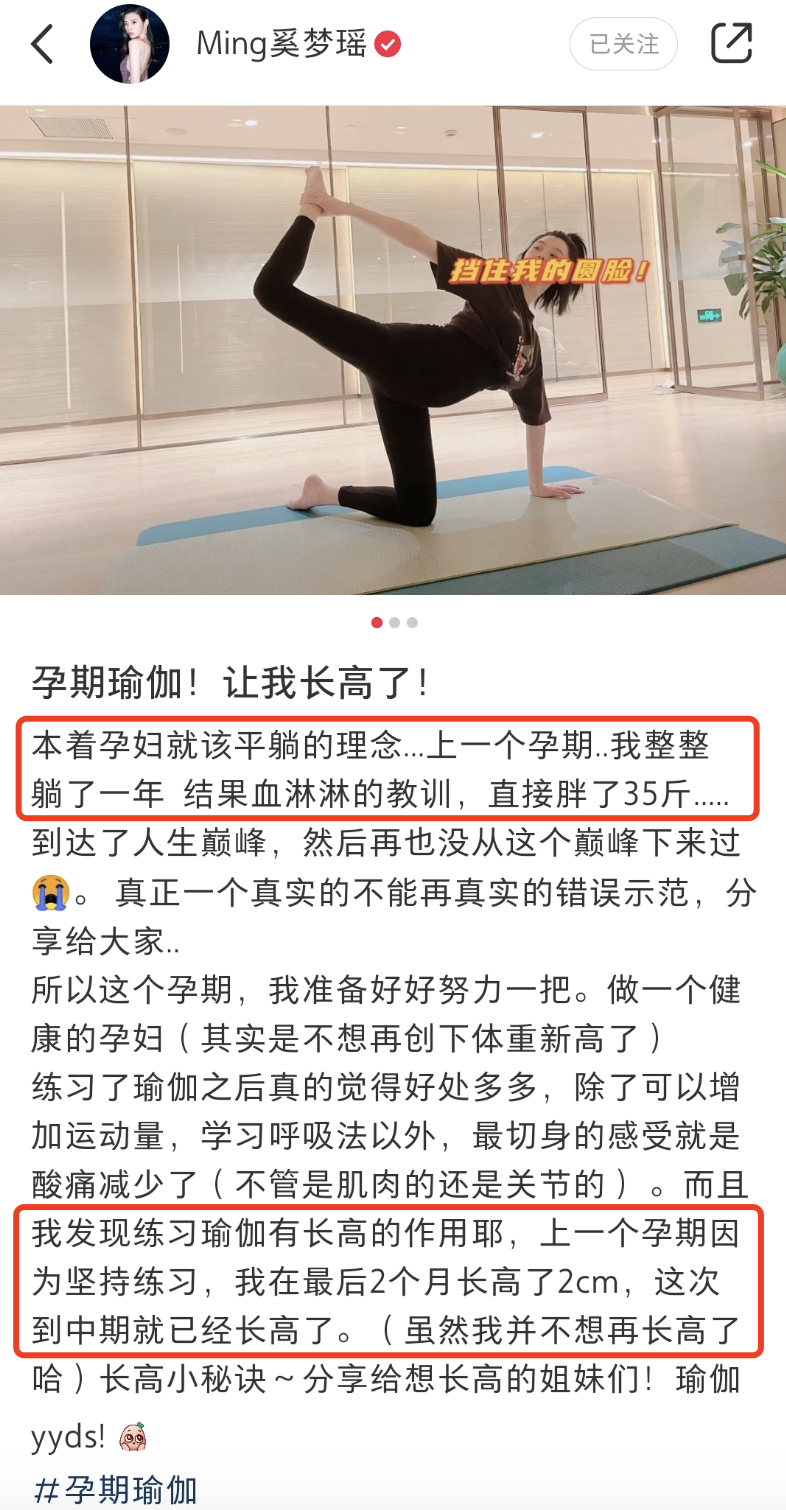 奚梦瑶还在坚持做瑜伽,她表示自己上次怀孕在床上躺了整整一年,直接胖了35斤,因为有前面的教训,所以这次她更努力地让自己动起来,还自称有长高。