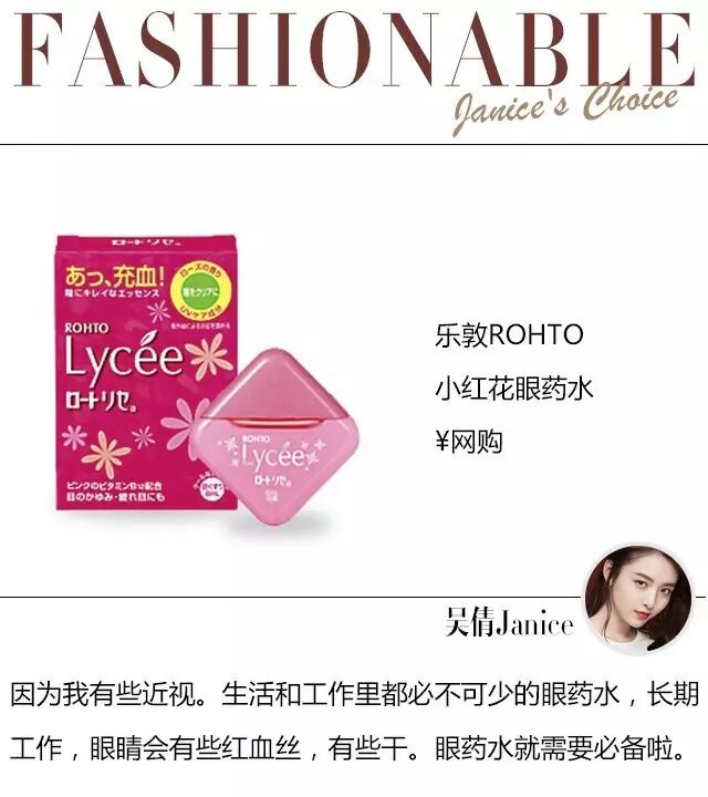 隐形眼镜专用的眼药水,近视姑娘的必备。外观粉红色看起来非常少女,工作和生活用眼疲劳时,可以呵护下眼睛。