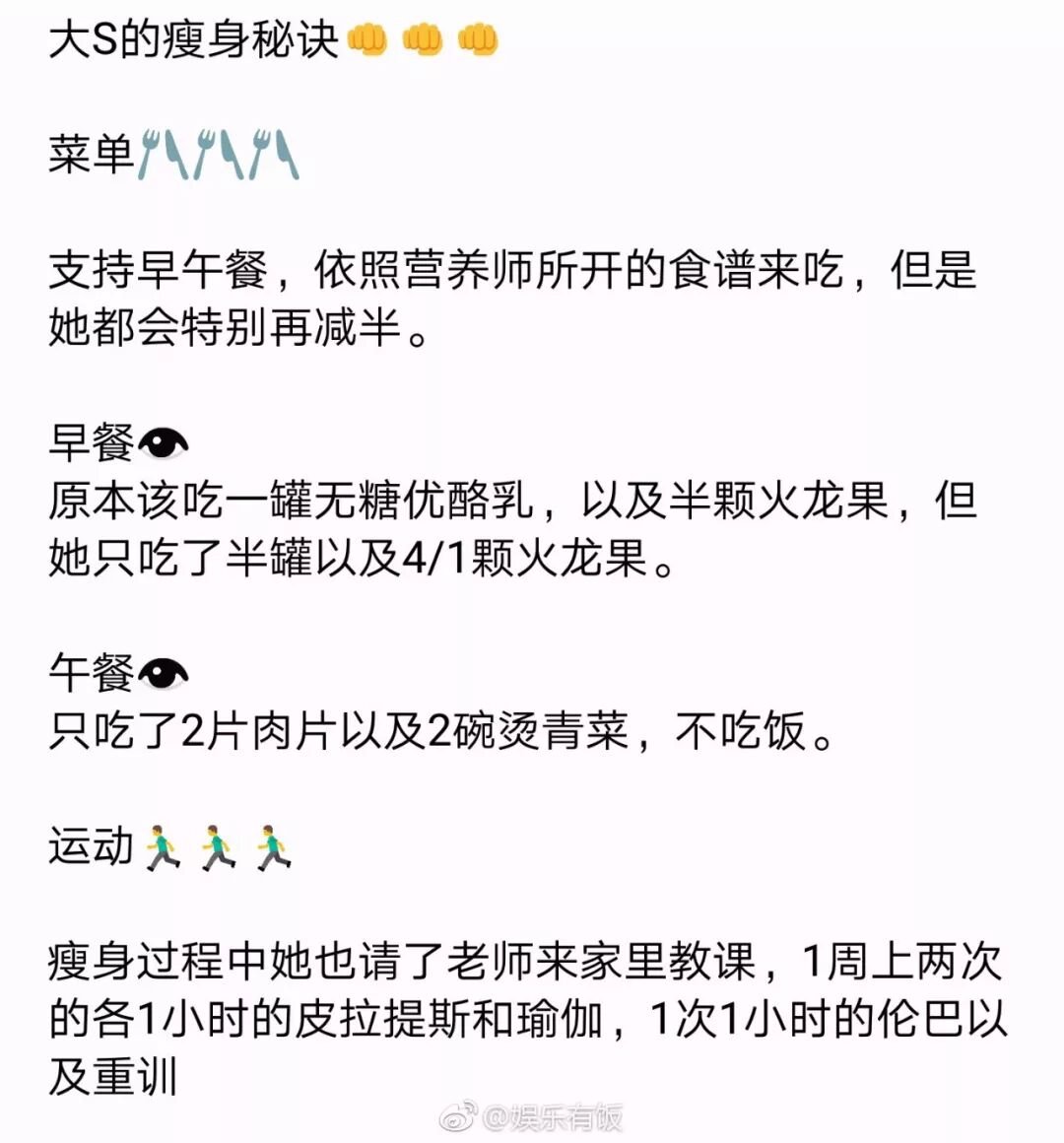 ▲前两天暴甩20斤肉的大S,也是依靠健康的食谱达到瘦身的效果。