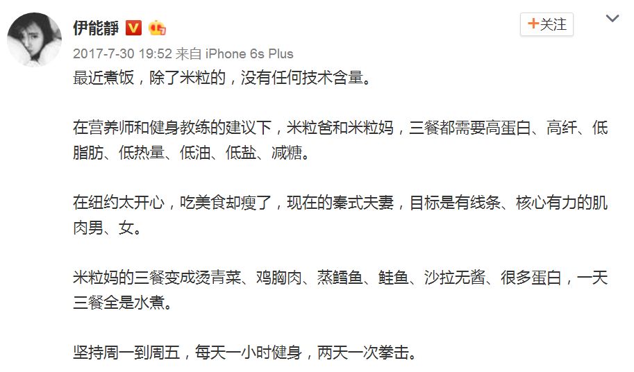 ▲伊能静自己在微博上开了一个叫“米粒妈食堂”的话题,经常在里面分享自己为孩子们做的美食,以及自己的菜单。高蛋白和水煮菜的搭配,营养又健康。