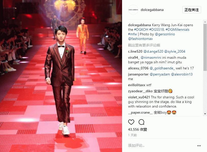 而作为Dolce & Gabbana 亚太直邀的90后首秀开场和领衔闭幕,王俊凯也成为了品牌史上第一个有此待遇的明星!也是中国男星登上奢侈品牌时装秀的最高规格(此处应该有掌声)▼