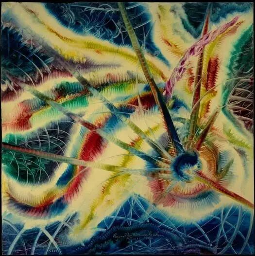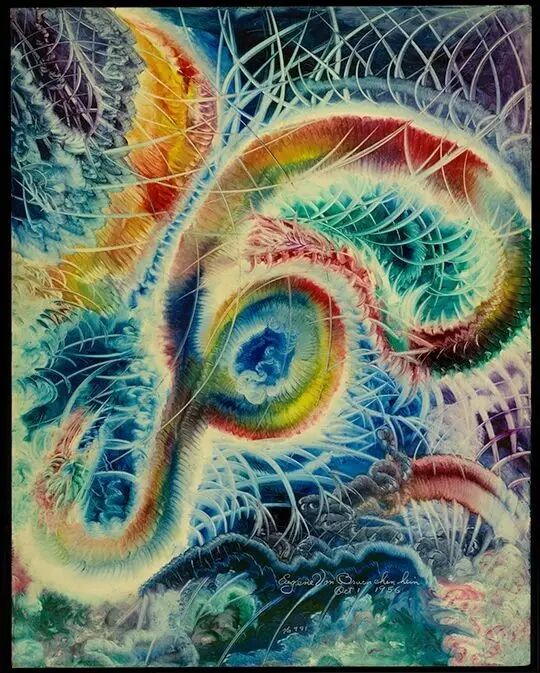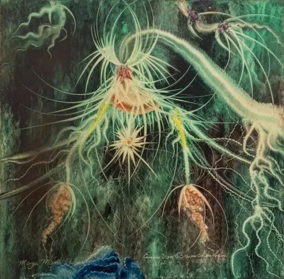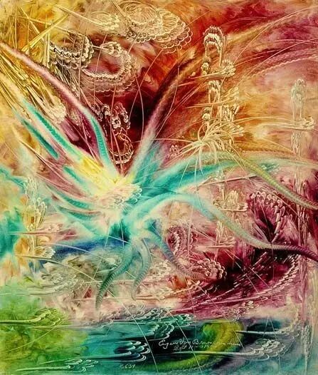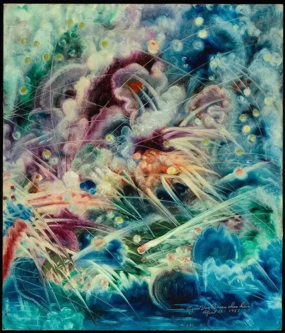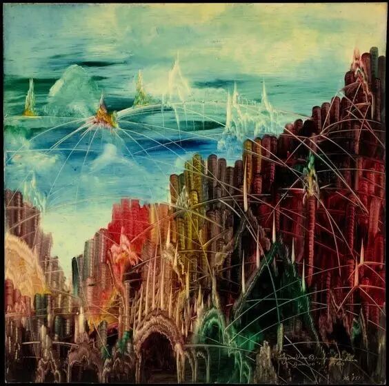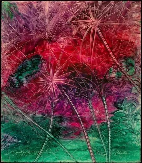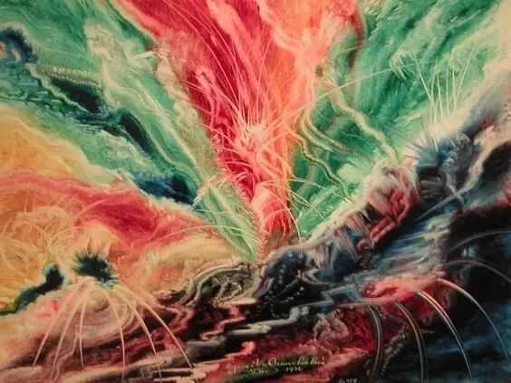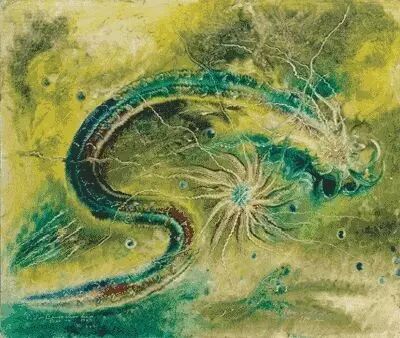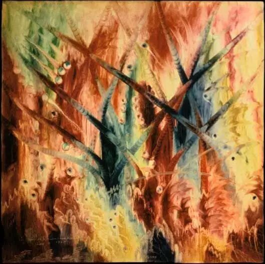 他形成了自己独特的绘画技巧:用手指迅速地涂抹稀薄未干的油画颜料,创造了神奇的漩涡、扭曲的光线以及梦幻的色彩。那些有机的形象代表了深海怪物和有刺的植物,后来还有城市和花卉。