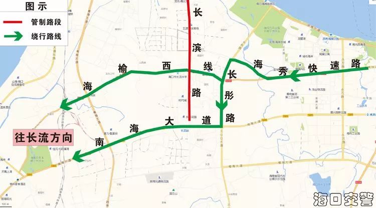 1、由海秀快速路前往长流方向的车辆,建议行驶至长天路匝道口或长彤路匝道口下海秀快速路,经海榆西线、南海大道行驶至长流方向。