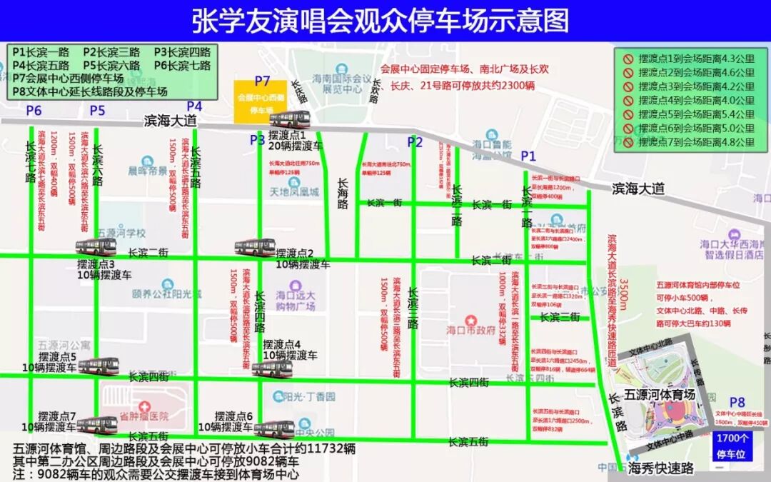 海口公安交警在省会展中心(约2300个停车位)及长滨一路、长滨二路、长滨三路、长滨四路、长滨五路、长滨六路、长滨七路、长滨东一街、长滨东二街、长滨东三街、长滨东西街、长滨东五街等路段规划的临时停车场(第二办公区域路段约7000个停车位)、文体中心中路延长线停车场(约1700个停车位)、文体中心中路延长线路段(约450个停车位),再乘坐摆渡公交到演唱会现场。
