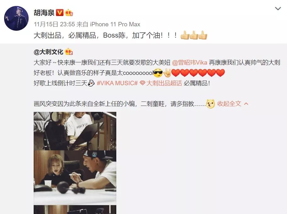 胡海泉还亲切的称呼陈羽凡为“boss 陈”,这也是胡海泉对陈羽凡继“涛贝儿、boss涛、元宝爹、兄台、我男人”之后的又一爱称,可见兄弟情义还是很深厚的。
