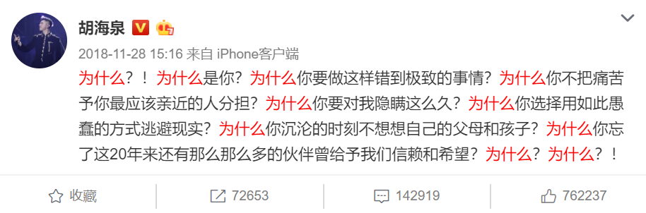 在陈羽凡吸毒被捕之前,羽泉组合正在准备成立二十周年的演唱会,那时候没有人会怀疑这对合作了二十年的兄弟的感情。在陈羽凡出事之后,胡海泉的微博十连问被指是刻意撇开关系,有人觉得他发这样的文字不够义气。