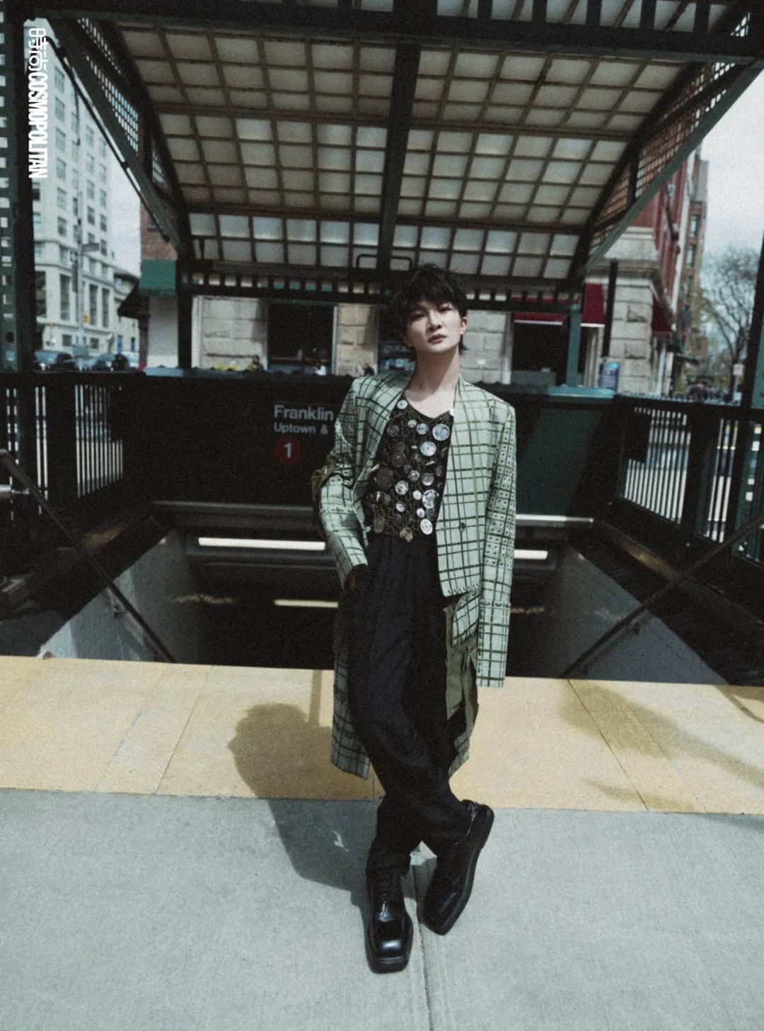绿色格纹口袋装饰风衣、瓷片装饰镂空背心