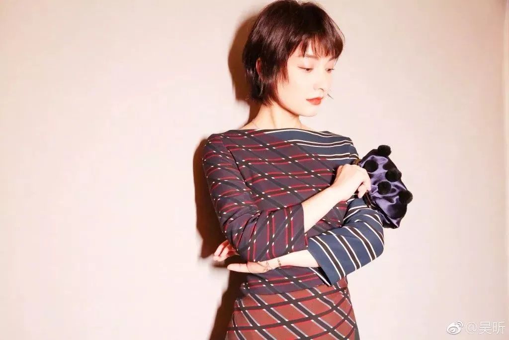 相比周冬雨略带朋克感的少女短发,吴昕的短发就复古了很多。眉上刘海,细碎的小卷,让之前的“时尚绝缘体”有了几分赫本的feel~