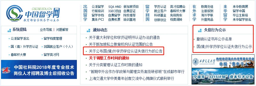 为了提醒更多的同学们要引以为戒,在中国留学网官网的首屏右页位置,出现了全新、醒目的失信行为公示板块: