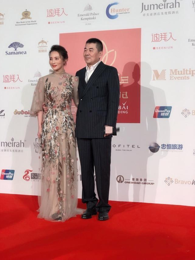 和她老公站在舞台上面可以看到这个时候整个人笑的挺开心的呀,所以看起来就会让人觉得比较的舒服,而且也是精心打扮了一下自己身上穿的这条裙子,可以看到上面是特别多的印花的设计,一点都不庸俗呀