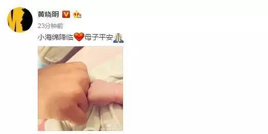 先由黄晓明工作室爆出喜讯,而后黄晓明微博晒出与儿子对拳温馨一幕!接连着四位明星喜获小公主小王子,三位王子一位公主,可见这位小公主将来一定又是惹人怜爱的公举,现在是不是特别流行晒手晒脚呢,看来只有我们这一位高颜值的妈妈晒出了娃娃的正面照,点赞!!!