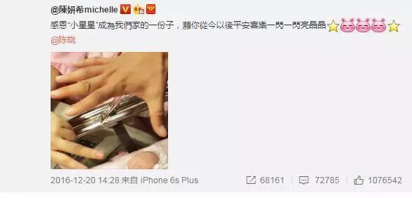 在元旦前夕陈妍希陈晓的小王子来报道!陈妍希晒文:“感恩小星星成为我们家的一份子,愿你从今以后平安喜乐一闪一闪亮晶晶” 取小名为小星星,配图一家三口比划拳