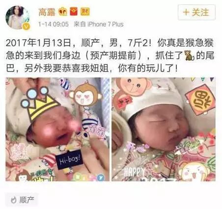 而在1月14日,高露第二胎也顺产小王子猴急的来到这个世界,凑成一对好字。晒出小王子的正面照片,婴儿小时候都长得差不多,但可以看出来,7斤2两的小王子脸胖嘟嘟,十分可爱