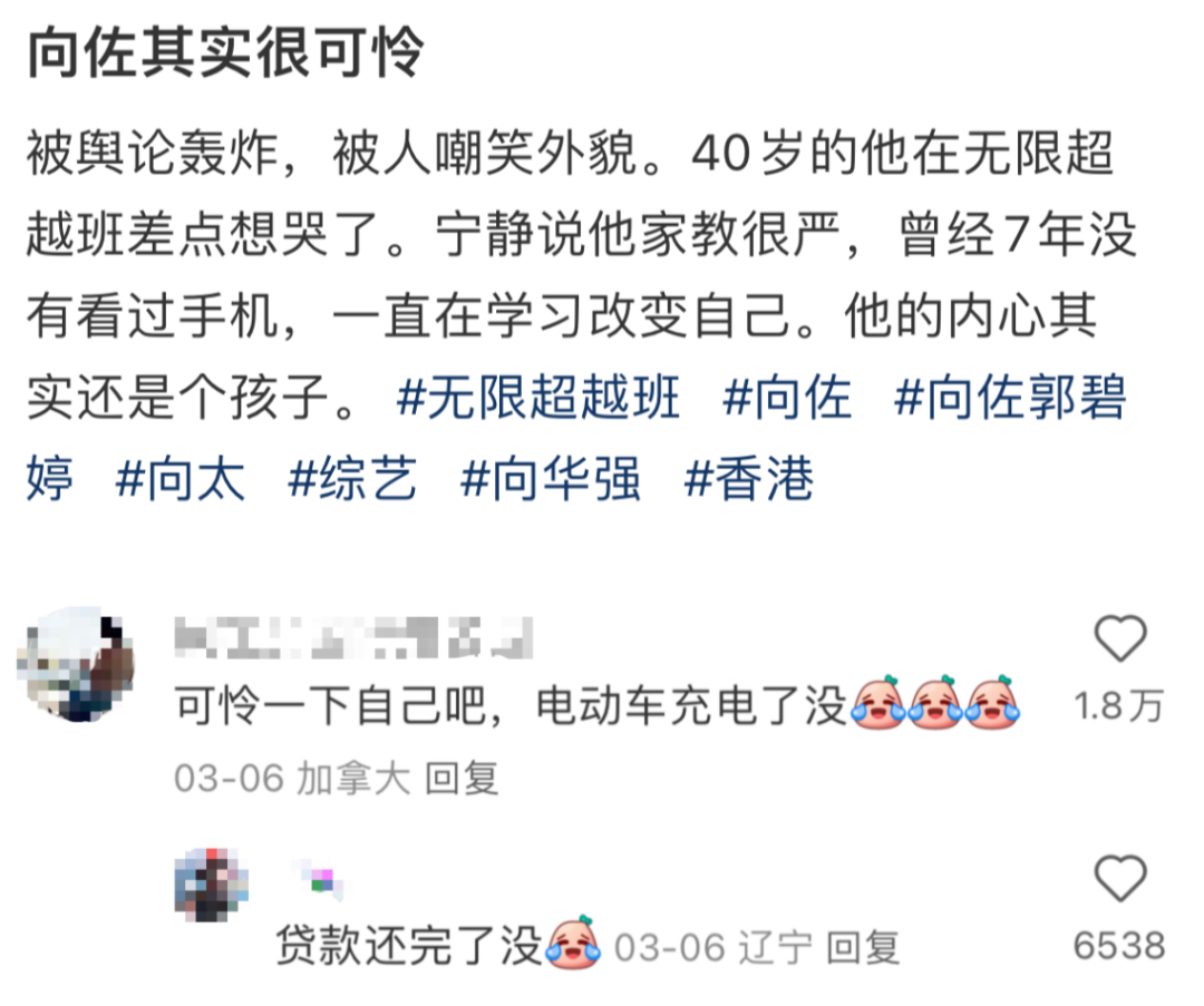郭碧婷复出打工,向佐演戏追梦 十点电影 港台女星 2024-03-17 21:49:07 334 创作不易,用心坚持,欢迎请BaGua喝几杯爱心咖啡!打赏并支持本文 打赏并删除本文 转载来源:十点读书会(sdclass)纵观娱乐圈你会发现,有两批人会常常成为“焦点”。一批是不断产出作品丰富社会文娱生活,引领大众审美取向的人。而另一批则主攻曝光和制造话题,给网友创造源源不断茶余饭后的八卦物料,一举一动戏剧性都能拉满。抛开褒贬不谈,存在即合理,向太一家如是。投身直播带货的向太屡败再战,追求演员梦想的向佐进入演员类综艺,两人一顿操作猛如虎,养活了半个自媒体圈做内容二创的博主。但最近惹人注意的还有婚后半隐退的郭碧婷,疑似即将通过《浪姐》第五季回归,被拍到上了官方节目组的车。 郭碧婷像个天生的明星,走到哪里都自带话题,即便婚后鲜少公开露面。在没有任何新作品的情况下,她依旧三天两头占据热搜。而自从娶了郭碧婷,向家在内娱闯荡的日子,台上台下拿出来都是一出真人秀。向佐的口碑,悄悄逆转自从向佐上了《无线超越班》这档演技综艺之后,话题几乎没断过。先是被嘲上热搜的演技。在第一场面试题中,向佐即兴出演《莫扎特之死》,一段翻白眼外加鼻孔用力式的演技,把导师们看愣了,把观众们看笑了。向佐的表演结束,多数导师选择沉默,只有吴镇宇和梁家辉做出了表演没有层次的评价。导师的反应也被观众调侃为:满朝文武百官支支吾吾。吴镇宇的表情更是被调侃“快碎了”。“世界名画”这样的剧情发展估计连向佐也没想到,一向严于律人的网友便开始了一场嘲笑向佐演技的狂欢,一批自媒体搞笑博主也跟风模仿向佐的表演。但向佐却用一招化解一切,先是认真录制了一段视频向吴镇宇老师道歉,“吴镇宇老师看完我的表演后快碎了,这次要和镇宇哥说一声对不起,我下次不敢了。”而面对那些模仿自己的视频,向佐也打开格局,秉持着打不过就加入的心态,直接评论:“表演100分!白眼翻的比我好。”趁着这股风头,向佐的团队又为他录制了一个回复网友评论的视频。评论区中首先涌现的是一批说他长得丑的言论。尤其向佐与郭碧婷同框时,有人说,“郭碧婷又美又优雅,向佐有鼻子有眼睛”。看到黑评的向佐不仅没生气,还给全网上了一课,来了一段高情商输出。网友说:“你这种杀马特,在我们县城里爸妈都不让和你玩。”向佐:“对不起你爸妈了。不好意思,我已经尽力去换这个造型了。”网友锐评:“郭碧婷好幸福,老公不回家。”向佐:“其实我天天都回家。”向佐用一种极尽诚恳的态度,用真诚打败网友,然后融入网友。调皮的网友开始因为向佐这股清澈的愚蠢而转变态度,从“好丑”变成了“好像有点顺眼了”。很显然,这届明星已经把互联网玩明白了,比起否认回避非议,和观众统一战线才会存活。只是,想成为好演员,这样的聪明还远远不够。错位矛盾的人设向佐在节目中态度端正又诚恳,承认自己还不足以在观众心目中成为一个演员,只不过会点功夫而已。他也说出自己的困境,上《无线超越班》是想接到更有发挥空间的角色,而不只停留在武打。回顾自己近20年的演艺生涯,向佐说:“从18岁到现在,从来没有一个人给我空间去演戏。包括中国香港全部的导演跟制片人,我觉得自己真的像一个废人一样。”还提到自己在二十六岁到三十二岁为练武闭关7年,每天练习10到12个小时不看手机,从体能和演技全方位进修自己。赶上话口的宁静顺便提了一嘴,向佐的家教之严格,二十四五岁的年纪晚上不到十点想出门见个朋友,却被向太劈头盖脸一顿骂,而向佐一句嘴都不还,默默上楼了。一个努力,低调,谦逊,被严格管教的傻孩子人设浮出水面,甚至有人开始说觉得向佐有点可怜,父母的光环对他来说就是阴影。可能有些人没意识到,向佐已经40岁了。了解向佐的经历之后,你会看到一种与节目呈现不同的矛盾感。向佐说因为父亲习武,所以出于自己对父亲的崇拜也去练武,而从2005年出道至今,向佐参演的影视作品多是豪华阵容的大制作。电影处女座《霍元甲》,同框的有李连杰、孙俪这样的一线明星;而第二部电影则是名导演陈可辛的《投名状》。虽然向佐只出演小角色,但要以一个普通演员的起点出发,是很难接触到这种资源的。而那个被有些人称之为阴影的原生家庭,为向佐投资5亿量身定制电影《封神传奇》,邀请李连杰、古天乐、范冰冰、黄晓明等超一线明星为他助阵。虽然向佐并非宣传中心,但人们却发现电影的主要人物正是向佐扮演的雷震子,但最终电影票房惨淡。接着,又邀请香港名导演杜琪峰为向佐执导一部主演电影《我的拳王男友》,既让向佐的功夫派上用场,人设扮相也符合向佐的形象风格,但向佐依旧不红,无人问津。这些机会和资源,在向佐眼中成了“没有表演空间”。一个40岁一事无成但依旧在坚持追梦,没有被父母强迫去做不喜欢的事,这样的人还不幸福吗?而向佐想要表现自己很努力,提到闭关7年进修的经历也被网友质疑:“虽然闭关,但是微博也没少发。不看手机,但是可以用电脑。”在向佐的世界里,不带一分钱去流浪是体验生活,磨练演技,但底层出身的吴镇宇可以一针见血地点破:“这不叫体验生活,这叫脱离生活。”站在舞台上的向佐嘴里说着渴望成为武打明星,但另一边又希望大众给他更多机会,不想只做武打明星。