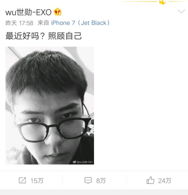 比起某些小鲜肉微博铺天盖地的精修自拍(非贬),世勋对自己的脸不是很在乎,更多的是对生活的热爱.