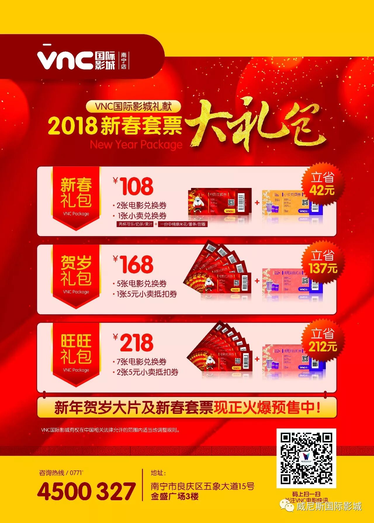 贺岁礼包:108元=2张电影兑换券+2杯可乐+1份爆米花