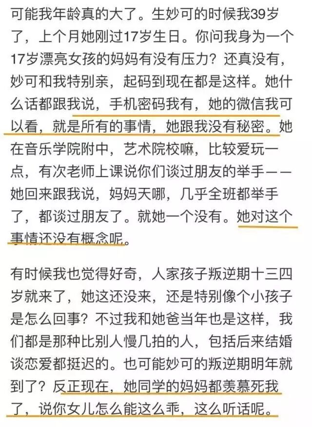 林妙可和她之间没有任何秘密,女儿的手机密码她都知道,女儿的微信也让她看,说林妙可对谈恋爱的事情还没有什么概念,同学的妈妈都羡慕她的女儿如此乖。